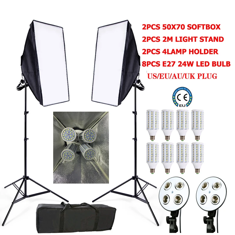 4lamps softbox photo studio kit 8pcs 24w LED E27 Bulb Photo stuido Soft Box set 2light stand 2softb